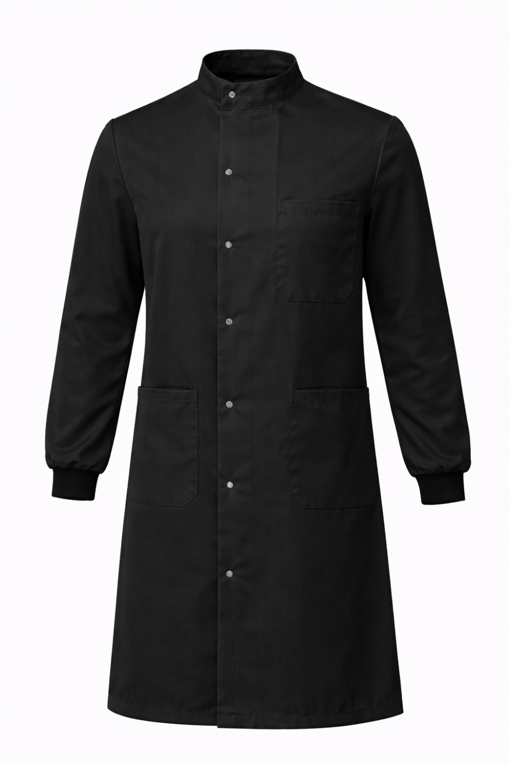 Howie style laboratory coat with stud fastening and black rib knit cuffs. Durable cotton drill fabric approximately 260-270 GSM. Washable at 30C. Available in multiple colours and sizes XS-5XL.