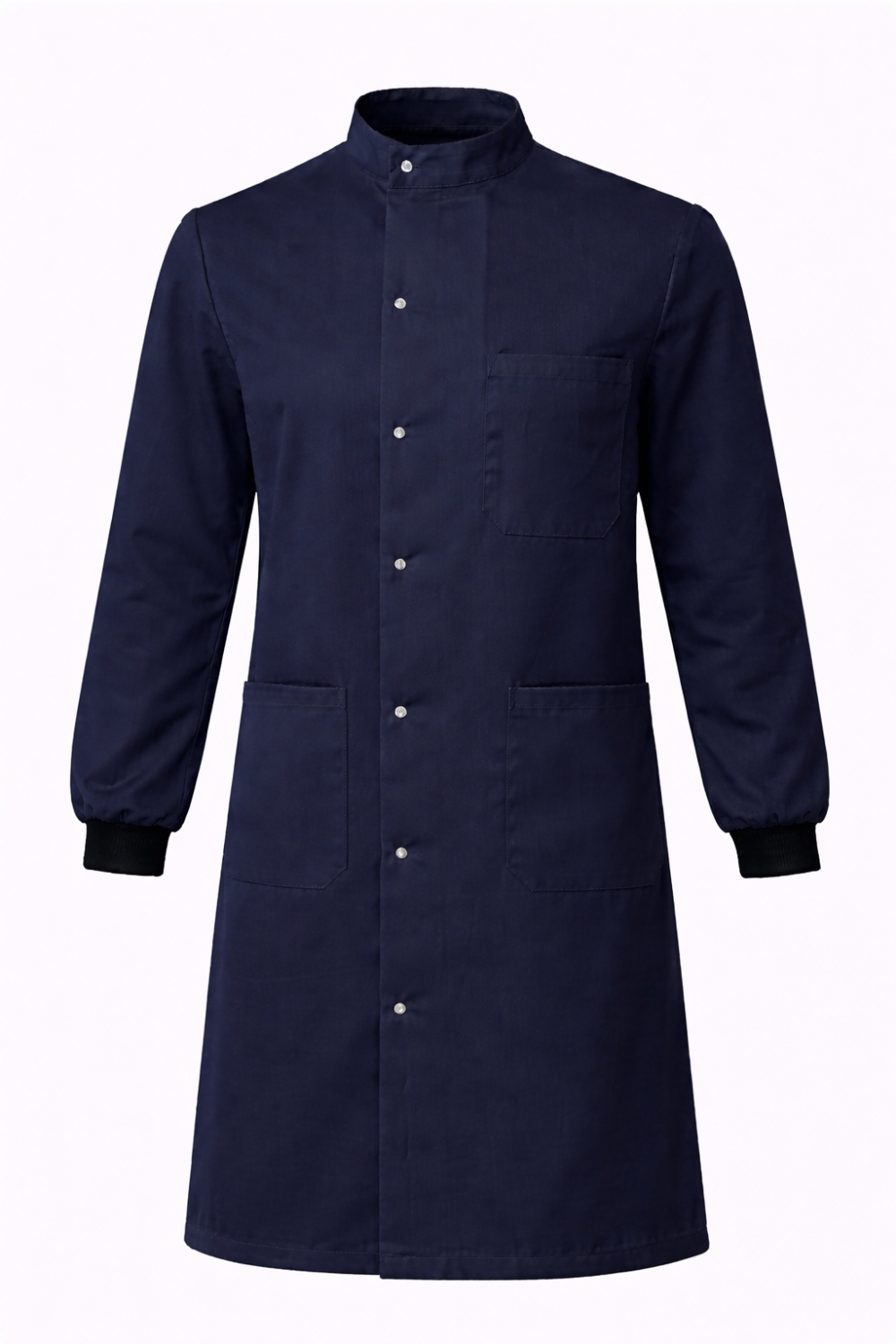Howie style laboratory coat with stud fastening and black rib knit cuffs. Durable cotton drill fabric approximately 260-270 GSM. Washable at 30C. Available in multiple colours and sizes XS-5XL.