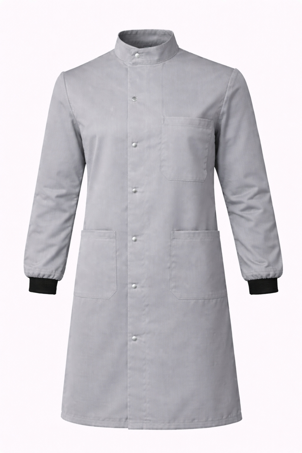 Howie style laboratory coat with stud fastening and black rib knit cuffs. Durable cotton drill fabric approximately 260-270 GSM. Washable at 30C. Available in multiple colours and sizes XS-5XL.