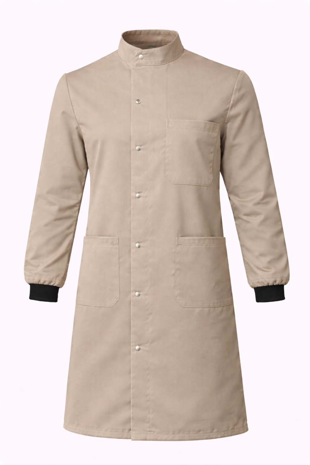Howie style laboratory coat with stud fastening and black rib knit cuffs. Durable cotton drill fabric approximately 260-270 GSM. Washable at 30C. Available in multiple colours and sizes XS-5XL.