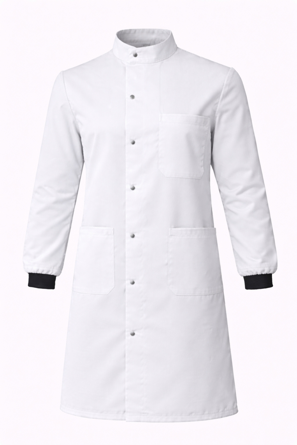 Howie style laboratory coat with stud fastening and black rib knit cuffs. Durable cotton drill fabric approximately 260-270 GSM. Washable at 30C. Available in multiple colours and sizes XS-5XL.