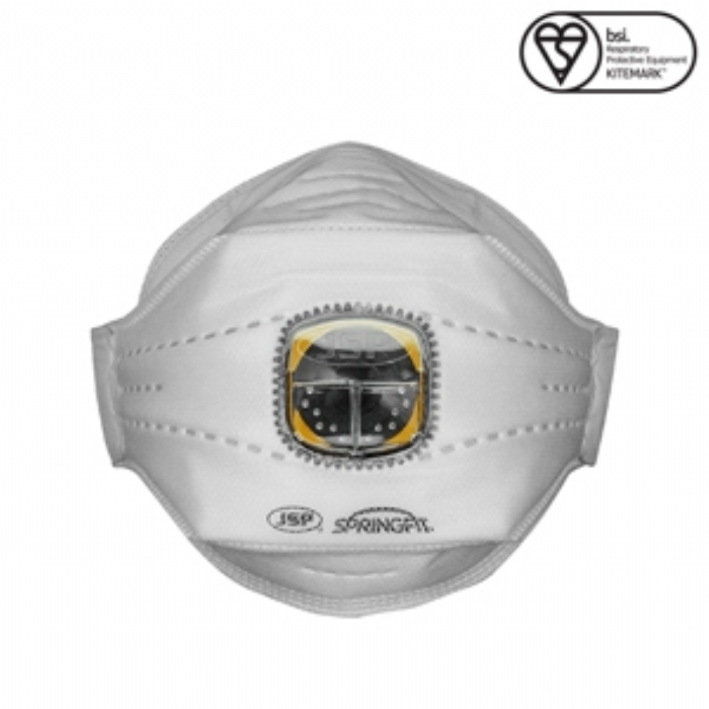 The JSP SpringFit™ 425ML FFP2 Disposable Mask with Typhoon valve provides EN149 FFP2 respiratory protection, fit and reduced breathing resistance, medium large size, supplied in boxes of ten.