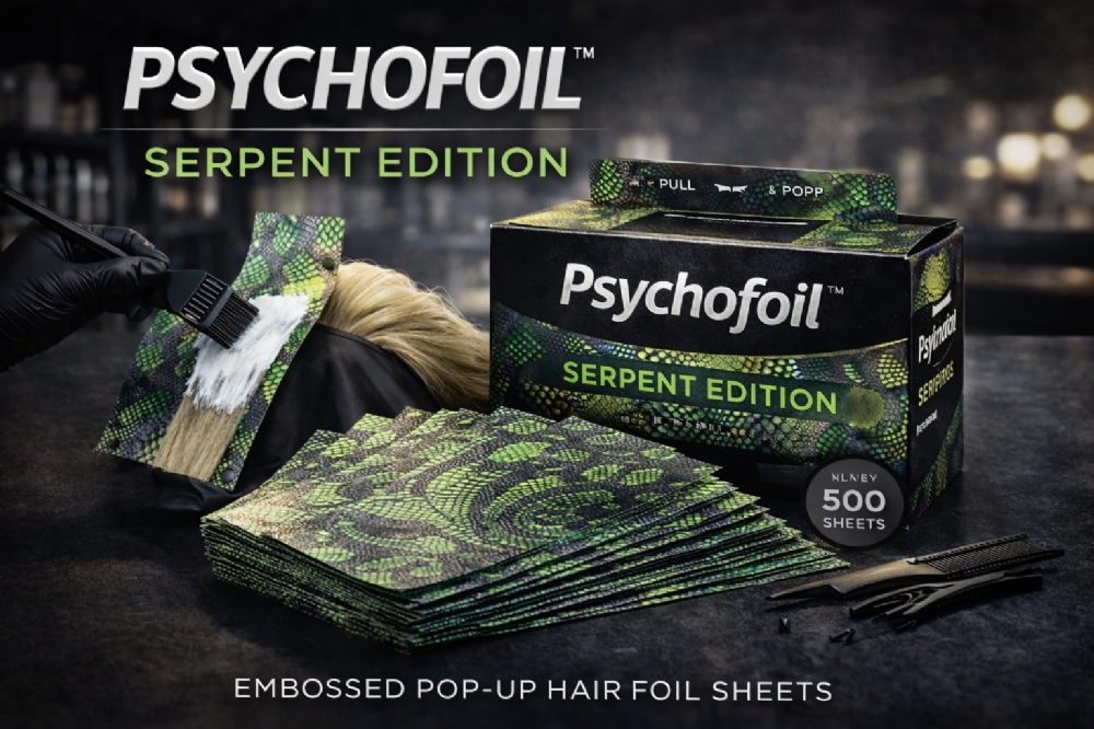 The Psychofoil™ Serpent Edition is a limited-edition, embossed pop-up hair foil designed for professional colourists and salons. With an eye-catching serpent print and textured aluminium surface, this foil delivers superior grip, clean folding, and precision control for highlights, balayage, and advanced colour techniques — helping stylists achieve consistent, flawless results every time. PSYCHOFOIL™?