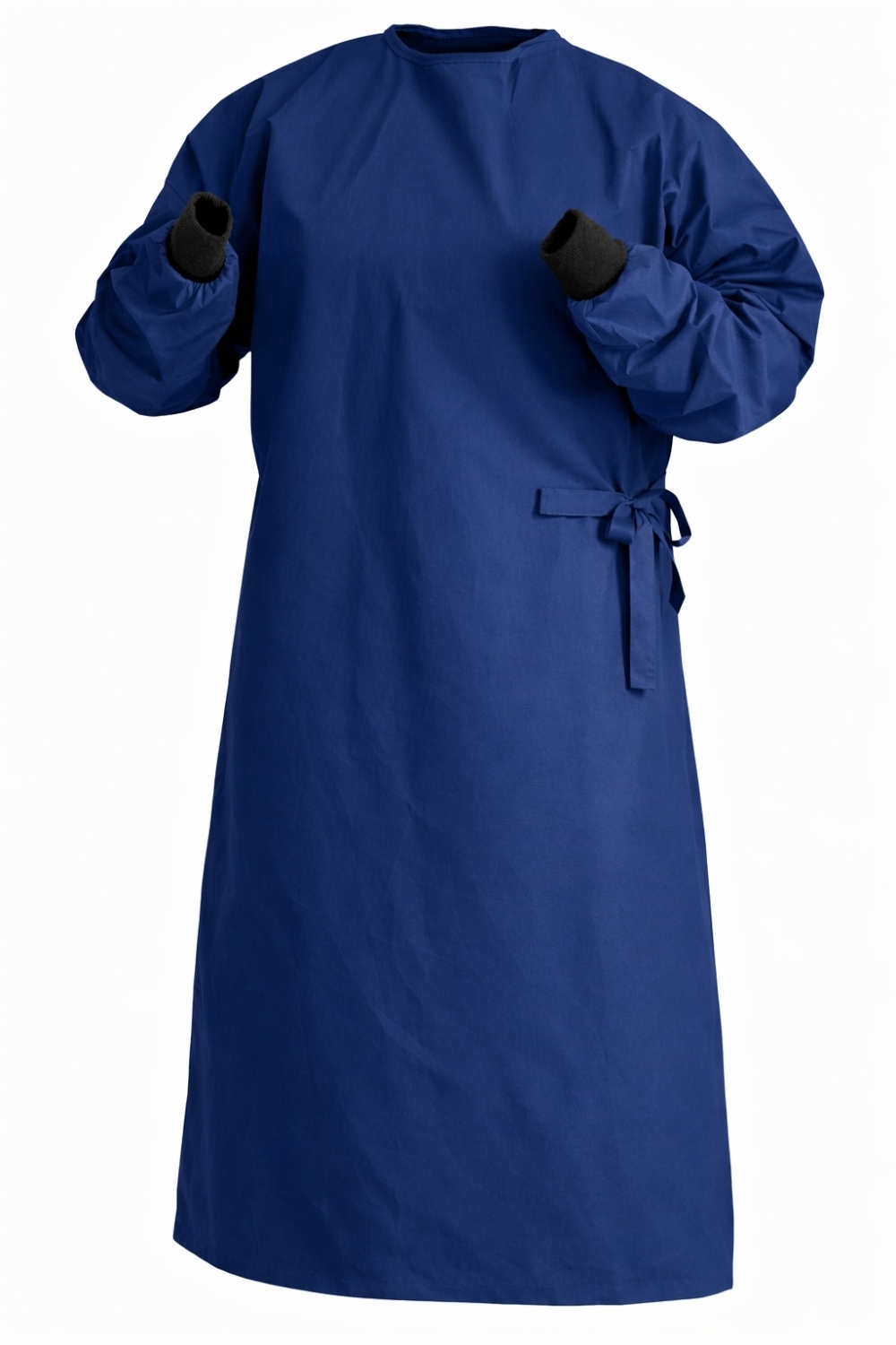 Professional reusable surgical gown made from durable 100% cotton. Designed for theatre, clinical and laboratory environments with secure tie fastening and comfortable long sleeve coverage.